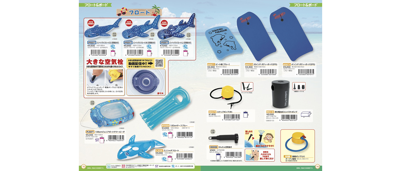 ジンベイザメ、シャチなどの大型フロートとビート板、ボディボードのラインナップです。